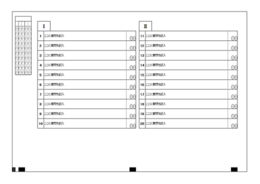 ◆加工例(国語の解答用紙を作成する例) ・上記のリンクからダウンロードしたテンプレート(新共通テスト「国語」型)エクセルファイルを開きます。(下図参照) ※このまま印刷しても採点可能なマークシートです。 ![]() ・次に,下図のように問題番号枠に番号を記入し,余白部分に必要な記述を行います。