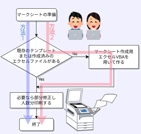 さらに、出題する試験問題にあったものであることも必要です。 当ソフトでは,適切な解答用紙を基本的なエクセル操作で短時間に作成することができます。 ・2種類の作り方が用意されています。 どちらもエクセルファイルに手を加え、お手元のコピー機(印刷機)を用いて普通紙に必要枚数分印刷します。 ・1つ目の手段(方法1)は,ソフトウェア附属のテンプレート(下記)に少し手を加え,問題に適したものを作成する方法。 2つ目(方法2) は,同梱のマークシート作成のためのエクセルVBAを用いて,自由にレイアウトする方法です。 いずれも基礎的なエクセルの操作により,簡単に短時間で作り上げることが可能です。 また,印刷コスト(用紙,インク等)のみで準備が完了できます。 以下に順を追って説明します。 | |||||||||||||