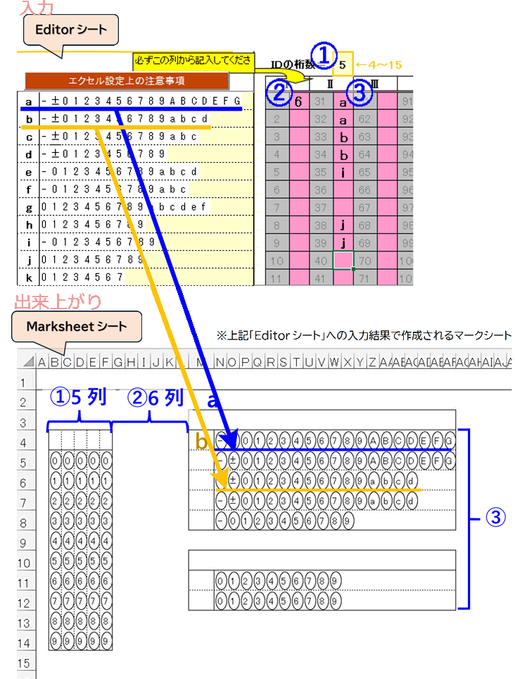 Step1: マークシート作成 設問に合わせてマークシートの解答用紙を作る(必要なもの:ウィンドウズPC,エクセル,プリンター) 《方法2》 付属のエクセルVBAを用いて自由にレイアウトする ◆マークシートを作成するエクセルファイル(VBA付き)をダウンロードしてください。 ※出来上がりの用紙サイズごとにファイルが異なっています。 ≪ご注意≫ネットワークからダウンロードしたマクロ機能(VBA)付きエクセルファイルについて 次の各サイトをご覧ください。 ◆ダウンロードしたエクセルファイル(VBA付き)を開きます。 ※開く前に、エクセルの「マクロを有効に」設定しておいてください。 下記は,A4横置きエクセルVBAファイル「A4_MarksheetEditor_markun.xlsm」を開いたものです。 ![]() 4つのワークシートのうち、始めは「Editorシート」を使用します。 マークシートは2番目の「Marksheetシート」に作られます。 ◆VBAの利用方法 ・AG列,AJ列・・・のピンク色のセルに半角小文字のアルファベット(a~z)または半角数字(1~9)を入力し『 』をクリックする。あとはVBAが自動でマークシートのひな形を作成します。 基本的操作はそれだけです。(下図参照) ▶動画で動作をご覧ください。 ◆上の例のくわしい説明