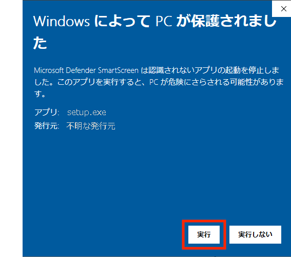 ※参考:本警告表示は、 Windows PC 保護のためのセキュリティ機能によるものです。 当社の提供するダウンロードファイルはウィルスチェック等を行っております。