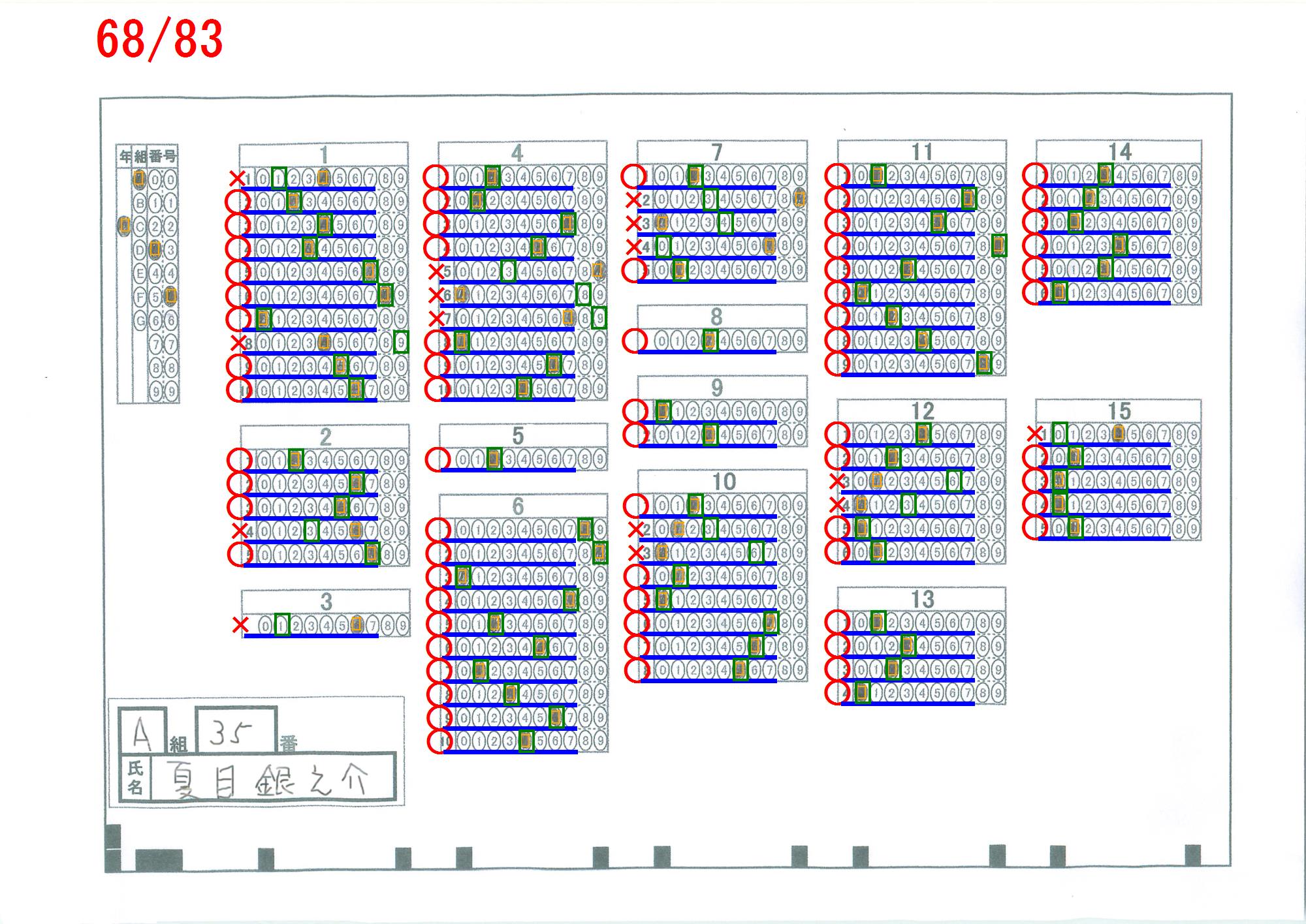 下記は採点が終了したときの表示です。(スキャンイメージが傾いていても問題なく採点処理ができます。)