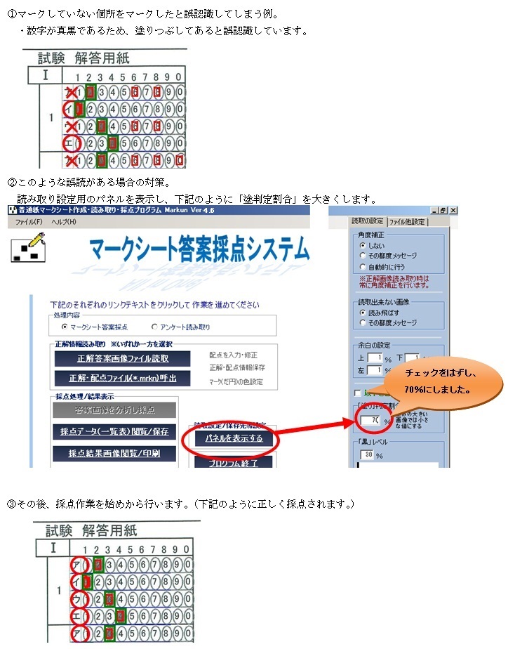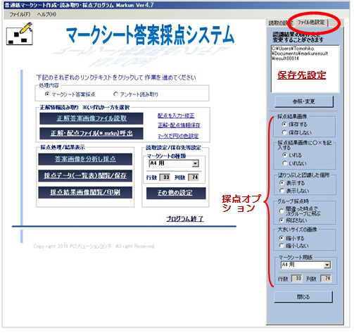 【採点/認識結果の保存先変更、答案に○×表記するかの設定】
